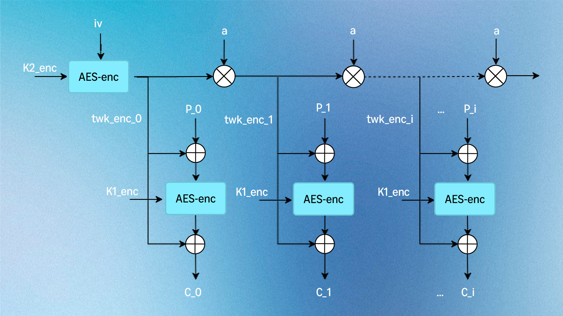 AES-XTS encrypts storage data using a two-key approach where each 128-bit block and its position-dependent tweak are subjected to an exclusive-OR operation (XOR), a binary operation that outputs a one only if the input values differ. The result of the operation is encrypted with AES, then XORed with the tweak again, ensuring that identical data at different disk locations produces different ciphertext. The tweak is generated by encrypting the sector number with a second key, then multiplying by powers of in a Galois field, creating unique values for each block position.