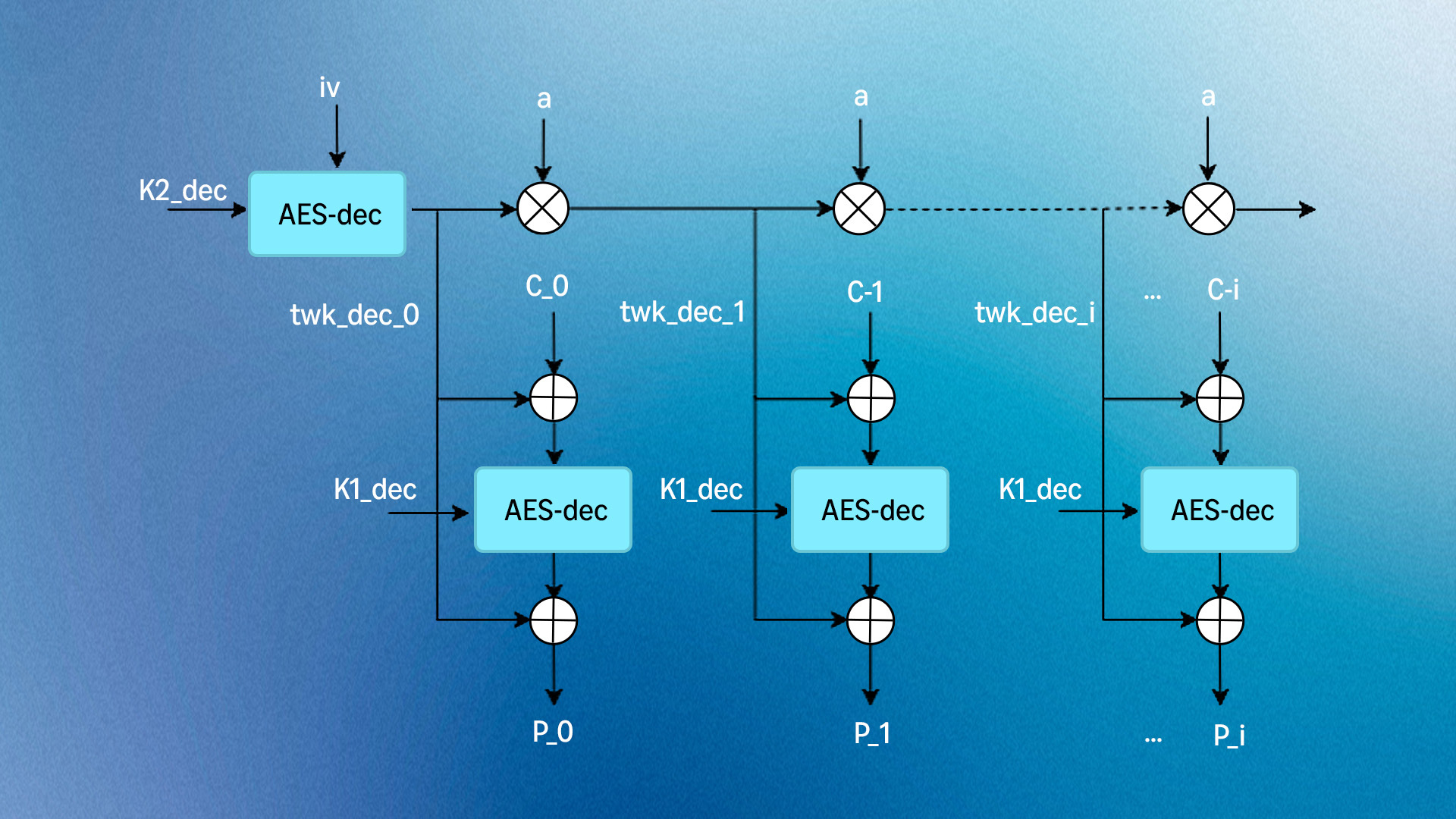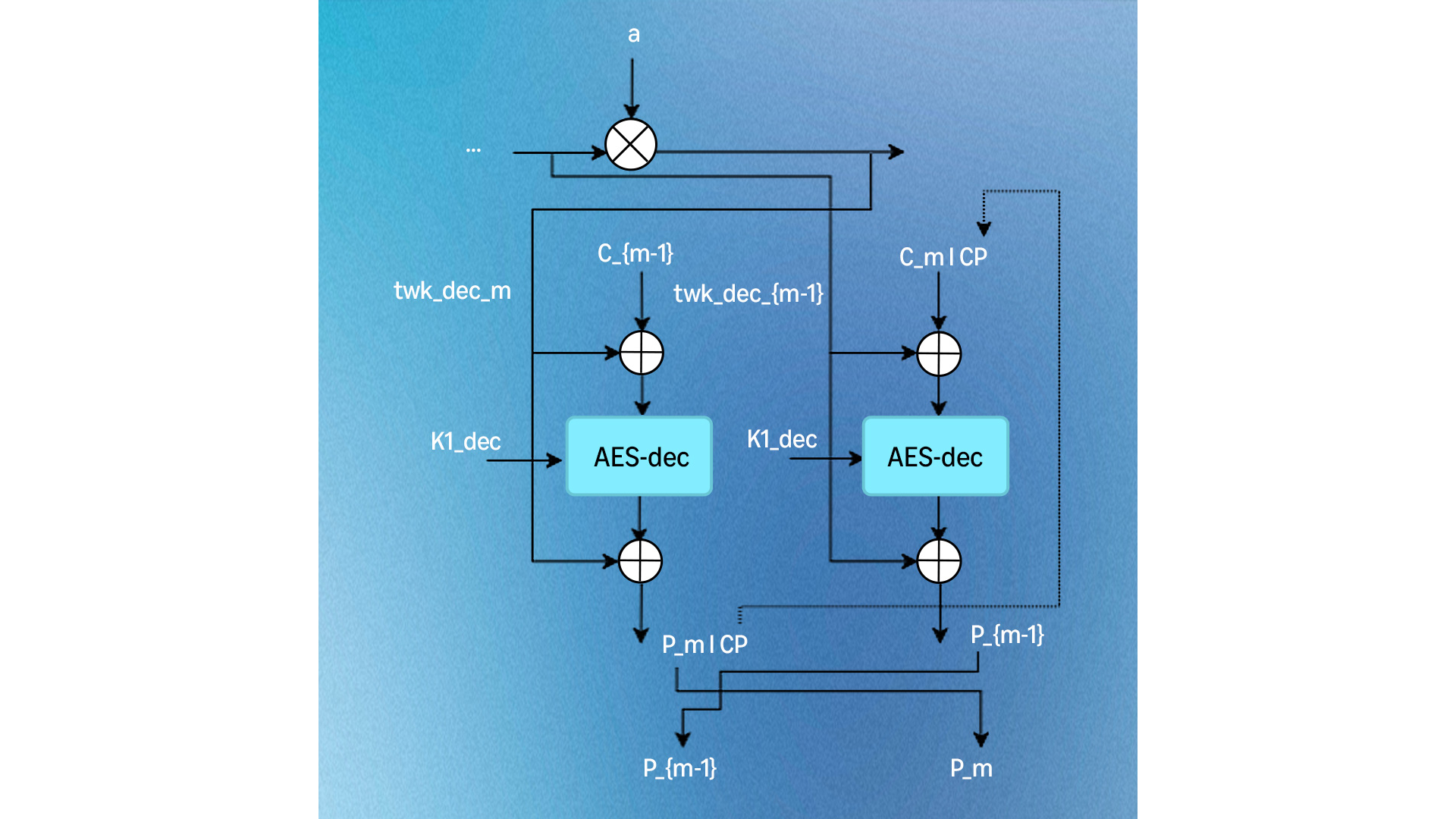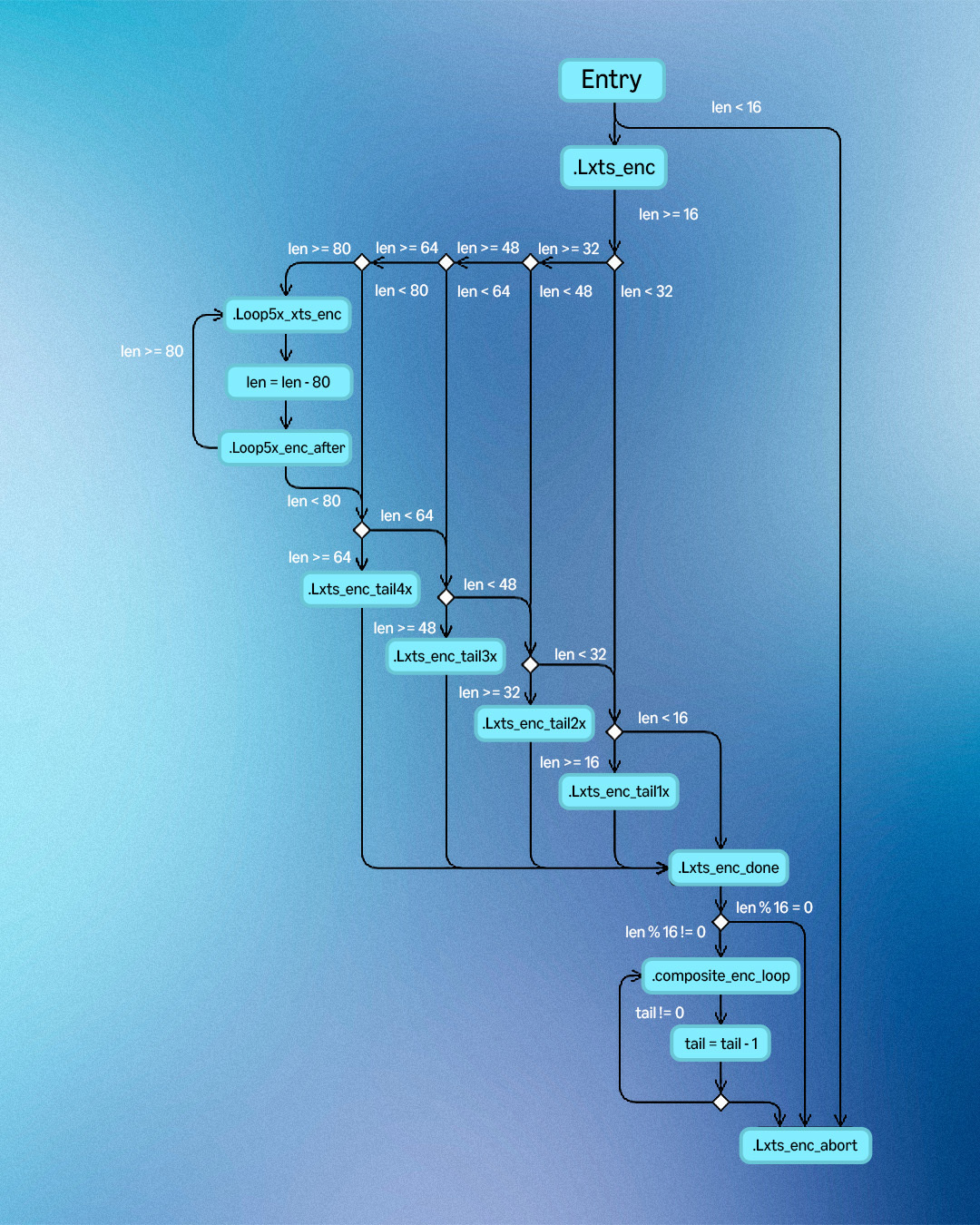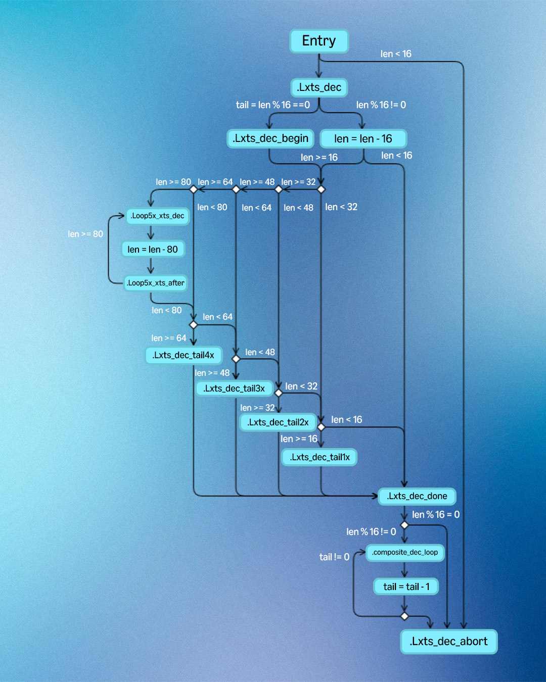 Once the loop ends, we have a separate processing branch to handle each possible number of remaining blocks, from one to four; all four branches end in ciphertext stealing. This can be seen in the control flow graphs of the encrypt and decrypt algorithms (see below). Throughout the code, we maintained the constant-time design mindset; that is, branching and special processing are based not on secret data but only on public values, the input byte lengths.